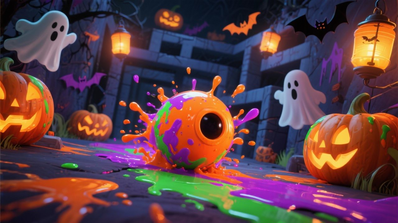 Use the arrow keys to roll your vibrant paintball through spooky mazes — splat, slide, and color every corner until the whole maze is glowing with bright Halloween hues.